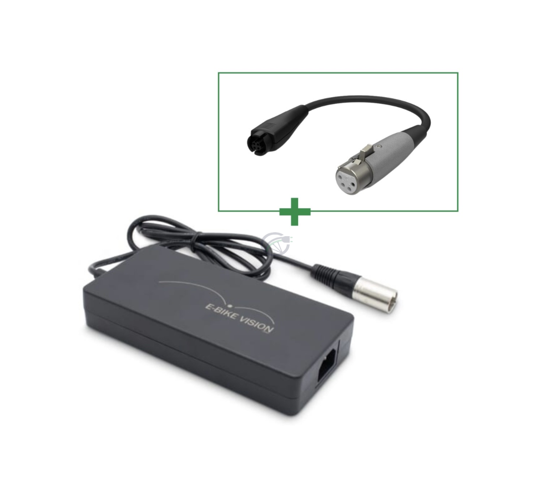 Ce pack se compose d'un chargeur de batterie 4A et d'un adaptateur Yamaha. L'adaptateur dispose d'une connexion à 4 pôles, de sorte qu'avec ce chargeur E-bike Vision, vous pouvez également charger votre batterie Yamaha. Ce chargeur a une vitesse de 4A, ce qui en fait un chargeur rapide.