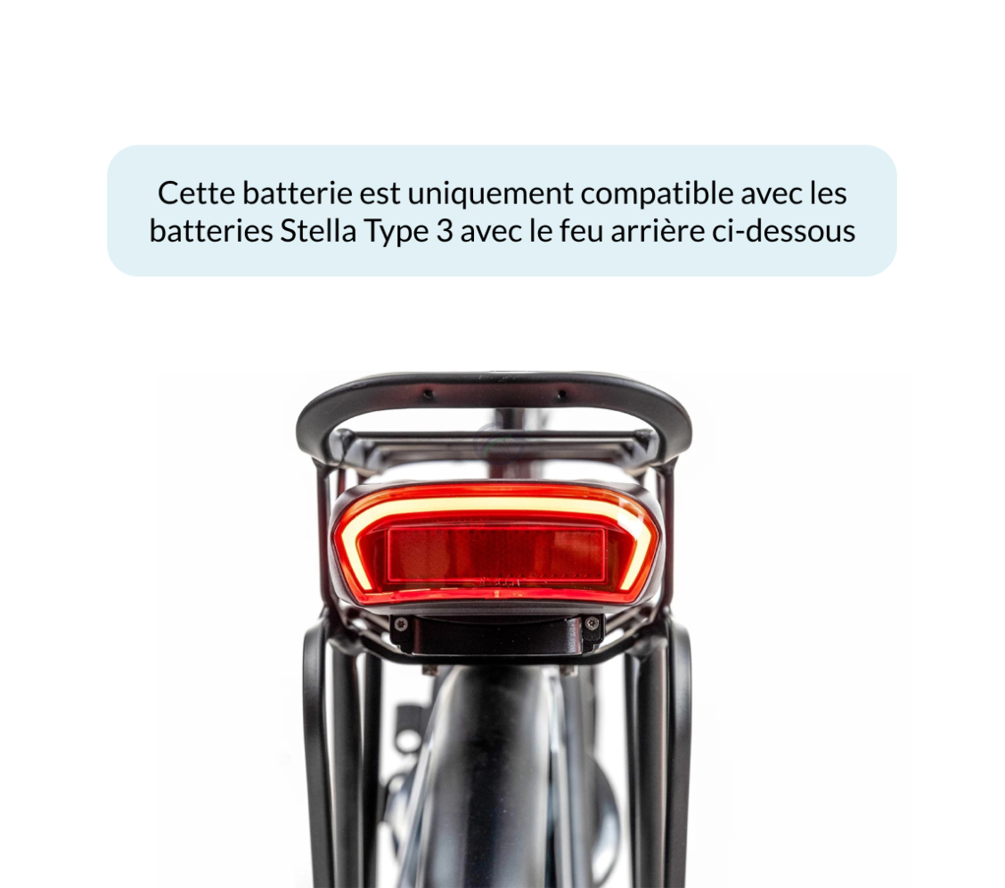 Attention : il existe deux versions de la batterie originale Stella Type 3, avec deux feux arrière différents. Votre batterie d'origine a-t-elle le même feu arrière que celui sur les photos du produit ? Dans ce cas, cette batterie compatible ne convient pas pour remplacer votre batterie. Si votre batterie d'origine est équipée du feu arrière plus récent, cette batterie compatible sera alors adaptée pour remplacer votre batterie actuelle.